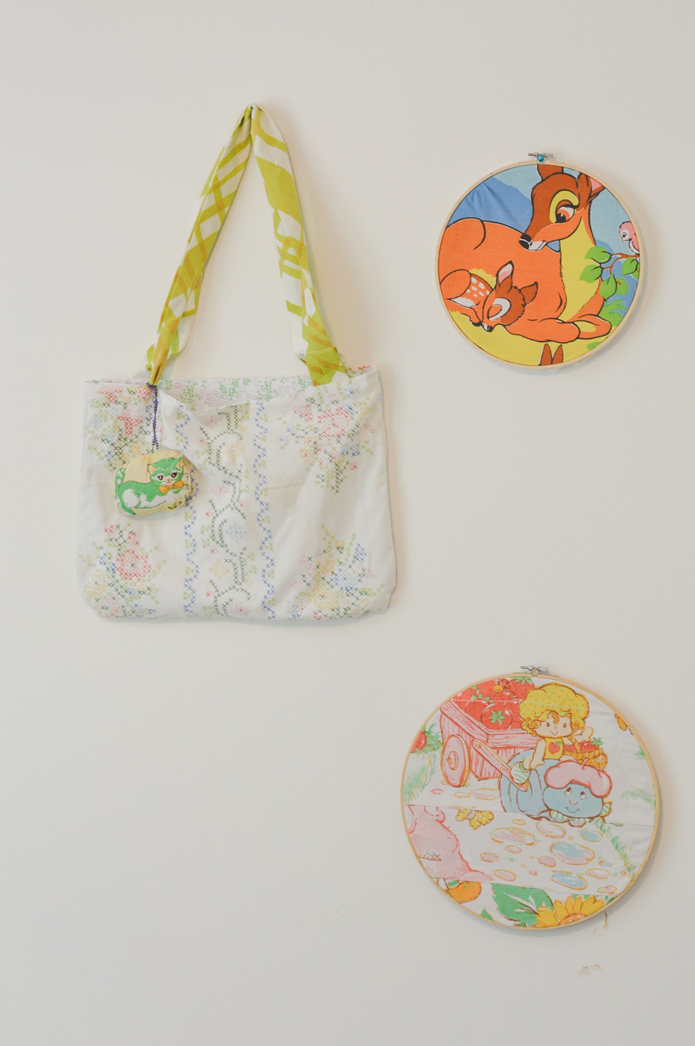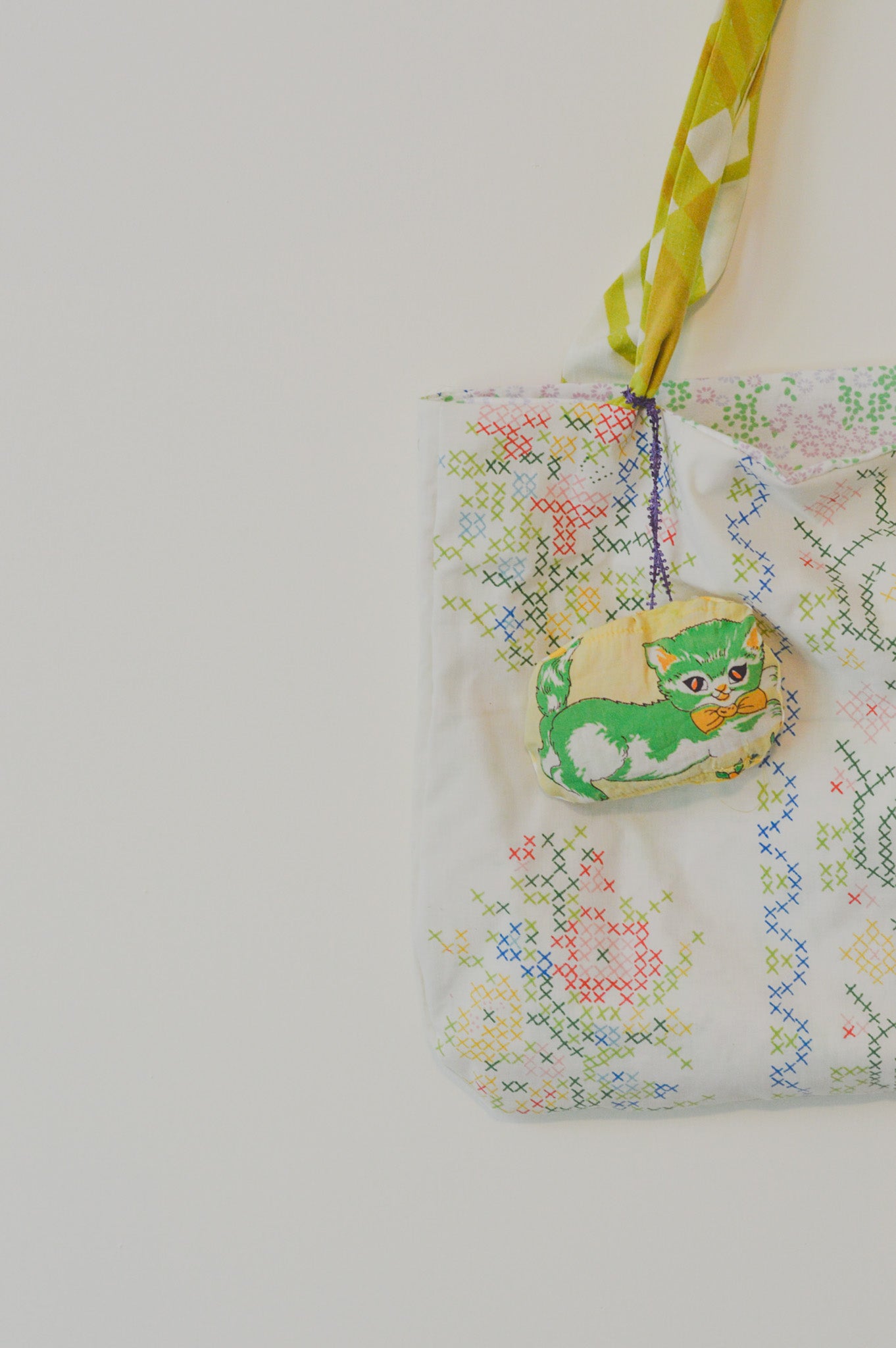Made with vintage bed sheets, one of a kind. Comes with bag charm.