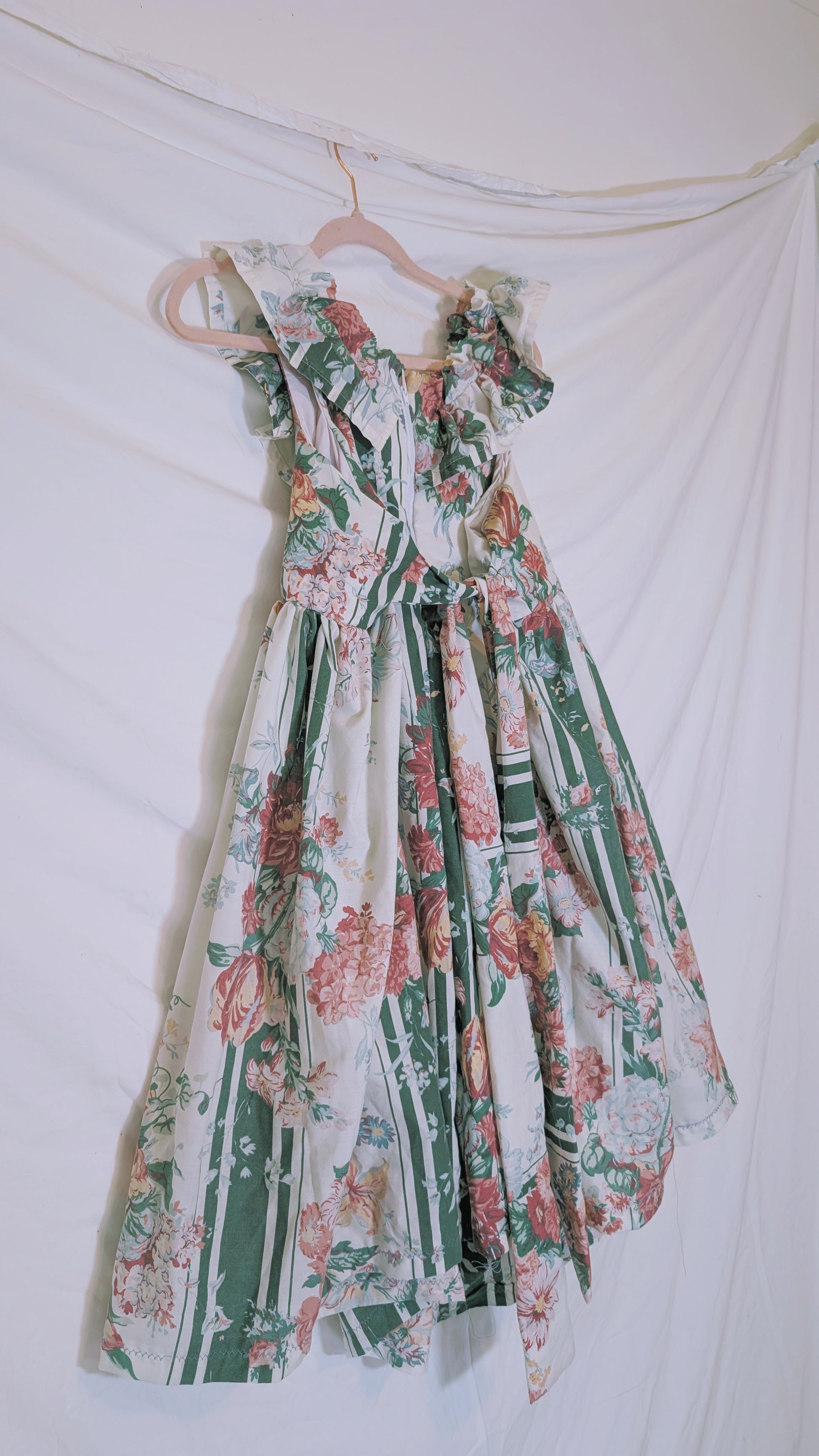One of a kind handmade sleeveless V-waist princess dress crafted from reclaimed and recycled textiles. This sustainable statement piece blends romantic, fairy-tale charm with intentional slow fashion design. Thoughtfully constructed in my studio using rescued vintage fabrics, each dress gives new life to beautiful materials that would otherwise be discarded. No two dresses are ever the same, making this a truly unique, heirloom-quality garment.